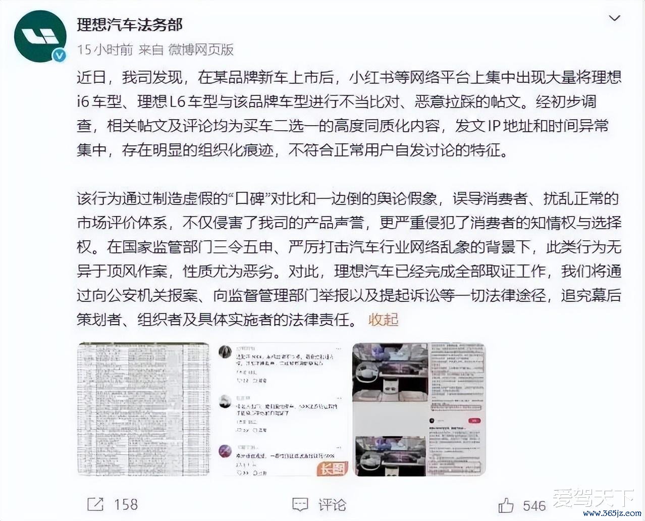 其背后缘由是,某品牌新车上市后,网络平台上集中出现大量将理想i6车型、理想L6车型与该品牌车型进行不当比对、恶意拉踩的帖文。理想是受害者,本应站在道德和法律的高地,但李想却用了不正确的方式来伸张正义。