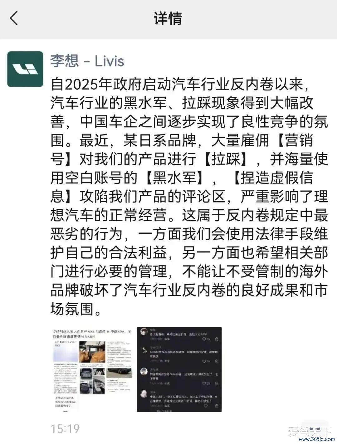 4月11日,李想在朋友圈怒怼一条,“历史证明了伪军往往比鬼子更操蛋,车企也不例外”,很快这条被删除。但随后,李想又发布了一条消息称,某日系品牌大量雇佣“营销号”对理想汽车的产品进行“拉踩”,并海量使用空白账号的“黑水军”,“捏造虚假信息”攻陷理想汽车产品的评论区,严重影响了理想汽车的正常经营。下方还配图日产NX8和理想i6的对比,以及网友评论NX8的截图。这也被解读为“枪口”直接对准了东风日产。